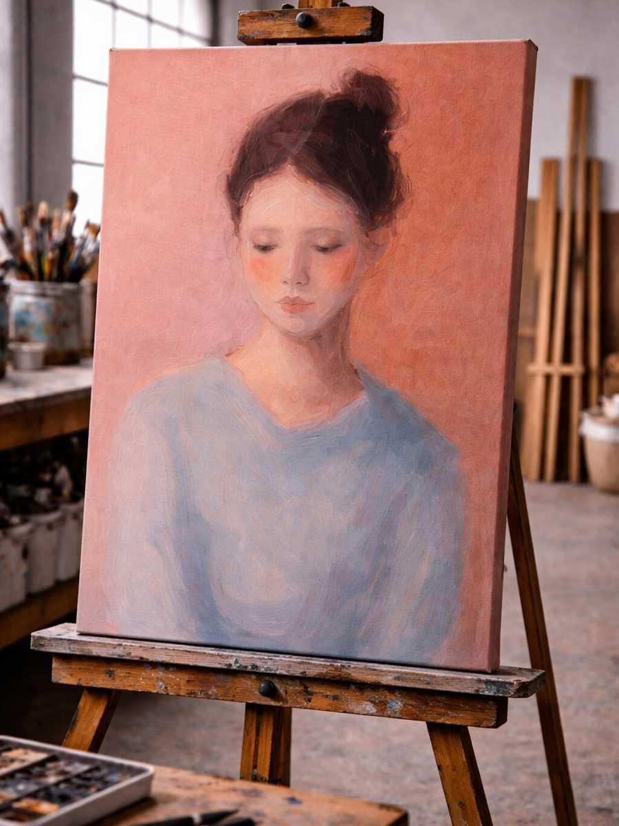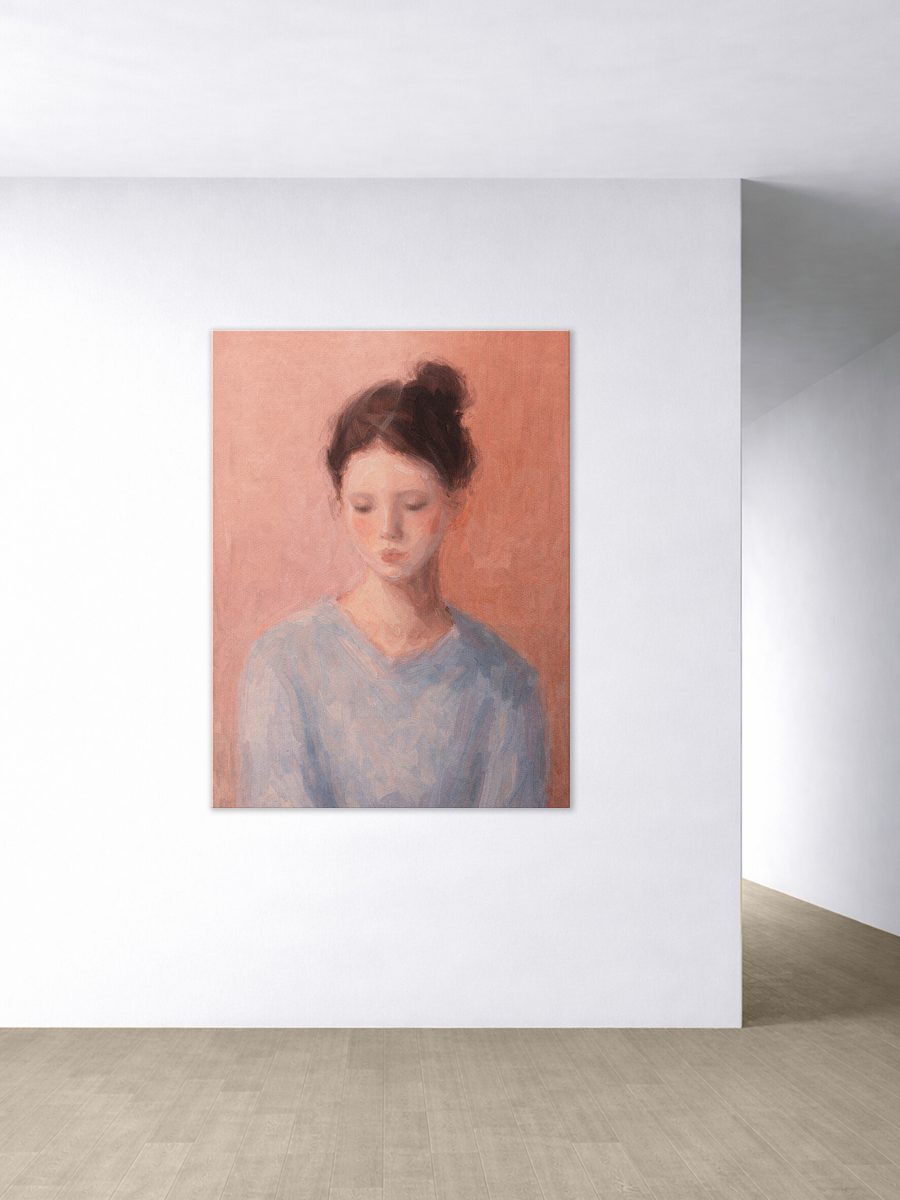 The artist's brushwork is delicate and layered rather than precise. Facial features are suggested more than defined, allowing light and color to do much of the emotional work. Cool, pale blues in the woman's blouse contrast tenderly with the warmth of the surrounding tones, creating a balance between vulnerability and quiet strength.